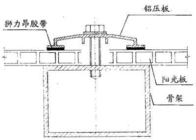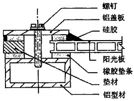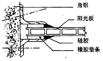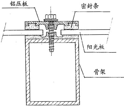 這種裝配系統主要用于小型的設施,如汽車庫、車站篷、雨檐、溫室以及其它許多替代玻璃的場合。當采用濕式裝配法,如下圖2所示基本要求是密封系統要能承受板材一定量的移動,允許熱膨脹而不降低其與框架及板材之間的粘結力。一般推薦使用中性硅酮膠與中空陽光板的濕式 裝配,但要特別注意,在使用前必須檢查所用密封膠的化學性,絕對不可選用酸性及堿性硅酮膠,因為這些固化劑會導致板材龜裂,尤其當有內應力時,在選用密封膠時,除考慮化學適性外,還要重點檢驗,延伸度及耐候性等。